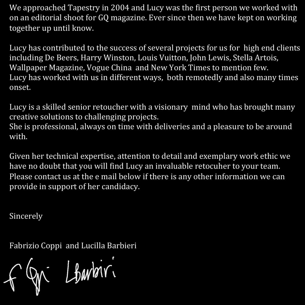 For over 15 years I was part of the team at Tapestry, working with high profile brands and photographers to create images that I am extremely proud of. I often worked on fast paced photoshoots and really enjoyed this process and the collaboration with like-minded peers.